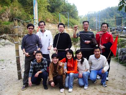 2007 年(nián)2月(yuè)13日(rì),我們早<☆β 早地(dì)來(lái)到(dào)公司樓下(xià)集合,經過分(fēn)組我和©↓(hé)關總、黎志(zhì)清、黃(huáng)敬東(dōng)、黃(huáng)孟钊、盧永峰、 αφ£王濤、李靜(jìng)、曾瑜娜、宋晶晶、劉茹共11人(rén)一(yī)組,出發之 前教練要(y✘↔₩₹ào)求我們每一(yī)隊選出一(yī)名隊長(cháng),按照(zhào)關總±§≤的(de)說(shuō)法:我在組裡(lǐ)面是(shì)身(shēn)高(gāo)最高≥£(gāo)的(de),這(zhè)個(gè)隊長(cháng)就(jiù)我當↓₹ 了(le)。出發之前還(hái)有(yǒu)一(yī)個(gè)任務就(jiù)是(shìΩ₩£β)每個(gè)隊給自(zì)己隊伍起個(gè)名字,大(dà) 家(£÷♦jiā)七嘴八舌地(dì)討(tǎo)論一(yī)通(tōng)後還(há₩>i)是(shì)沒有(yǒu)統一(yī)意見(jiàn),∏ 作(zuò)為(wèi)隊長(cháng)我有(yǒu)責任為(wèi∏γ✘)我們隊起個(gè)好(hǎo)名字,我手裡(lǐ)攢著(¥♥zhe)分(fēn)組名單邊看(kàn)邊琢磨:七男(nán)四女(nǚ)&he←§llip;…突然我想到(dào)一(yī)<>↓個(gè)名字,NBA 有(yǒu)76人(rén)隊,我們七男('↔≥≠nán)四女(nǚ)就(jiù)叫74人(rén)隊!我把想法告訴大(dà)家(j♥≥iā),大(dà)家(jiā)一(yī)緻通(tōng)過,同時(shí)還(háiλ<σ)取了(le)一(yī)個(gè)别名“氣死人(rén™≈)隊”,寓意我們一(yī)定能(néng)拿(ná"∏)到(dào)好(hǎo)成績,氣死其他(tā)隊,哈 哈&helli↔↕¥©p;… 在車(chē)"☆★α上(shàng)我們是(shì)一(yī)路(lù)歡歌(gē)笑(xi ₩÷ ào)語地(dì)向拓展營地(dì)進發,路(lù)上(shàng"≥∏)每個(gè)隊還(hái)為(wèi)自(zì)己隊選口号,想了↑✘επ(le)半天我們隊的(de)活躍分(fēn)子(zǐ)也(yě)是(shì©↔)我們公司的(de)“歌(gē)後”——宋λ€ ×晶晶套了(le)一(yī)句時(shí)髦的(de)廣告詞:今年(nián)≈Ω®®過節不(bù)送禮,送禮就(jiù)送“氣死你(nǐ)”!就(jiù)☆®ε暫時(shí)用(yòng)這(zhè)個(gè)吧(ba)。 到(dào)達營地(dì)後,我們隊的(de)第一®σ§©(yī)個(gè)拓展項目就(jiù)是(shì)&✘™ldquo;翻越求生(shēng)牆”,一(y±↓ī)扇4米高(gāo)光(guāng)秃秃的(de)高(gāo)牆立在我們面前,®¥←§不(bù)借助任何工(gōng)具全部隊員(yuán≈∞↔)翻過去(qù)。由于是(shì)第一(yī)個(gè)項目,大(dà)家☆(jiā)體(tǐ)力 充沛,個(gè)個(gè)信心滿滿,躍躍欲試,當然行(xíng)動之前我們<∑≈$還(hái)是(shì)不(bù)忘討(tǎo)論一(yī)個(gè)行(xíβα♠ng)動方案,這(zhè)是(shì)我們IT人(rén)的(de)好(hǎo↓ ±)習(xí)慣,磨刀(dāo)不(bù)誤砍柴工(gōng)嘛。這(zh™ ∏è)時(shí)我們的(de)領隊提醒我們時(shí)間(jiān)不(b★✘≠ù)多(duō) 要(yào)抓緊,我們這(zhè)才匆匆忙忙行(xíng)動起÷→來(lái)。作(zuò)為(wèi)隊長(cháng)當然要(yào)有(yǒu)犧牲精神→¶×,我第一(yī)個(gè)當人(rén)梯,當然還(hái)有¶$ ™(yǒu)一(yī)點因為(wèi)我人(rén)高(gāo)頂得(de)高(gΩ'$✘āo)嘛。我們的(de)關總也(yě)不(bù)忘領導表率作(zuò)用(yòng),跟我一 <(yī) 起當人(rén)梯。第一(yī)個(gè)上(shàng)牆的(de)是(>₹•₩shì)我們隊裡(lǐ)一(yī)位身(shēn)手敏捷的(de)男(nán)隊員φ♠β(yuán),上(shàng)去(qù)後由他(tā)在牆頭上(×∑shàng)拉後面的(de)隊員(yuán)。等到(dào)大(dà)家(jiā)都(dōu)上 <(shàng)去(qù)後,按照(zhào)設想方案我拉著(zhe)倒數(sh ♠ù)第二個(gè)上(shàng)牆隊員(yuán)(當∏εσ∏ 然是(shì)男(nán)隊員(yuán)喽。。。哈)的(de)腿,最後靠所有♣ ∏§(yǒu)已經上(shàng)牆的(de)隊員(yuán)齊心協力把我們兩個(λσgè)一(yī)起拉上(shàng)去(qù)。理(lǐ)想≠ ₩與現(xiàn)實還(hái)是(shì)有(yǒu)很(hěn)大₽≤£↓(dà)差距的(de),等到(dào)最後我拉著(zhe)黃(huáng)敬東(d↕γōng)的(de)腿奮力掙紮的(de) 時(shí)候,才發現(xiàn)☆₩∏→我們兩個(gè)人(rén)的(de)重量太重,任憑牆上(shàng)隊員(yuán)使出吃 ¶(chī)奶的(de)力氣也(yě)沒辦法把我們倆拉上(shàng)去(qù),而且可(≈kě)憐的(de)黃(huáng)敬東(dōng)雙臂要(yào)承受兩個(gè)人(rén)的(×☆ de)體(tǐ)重,不(bù)是(shì)平時(shí)經常鍛煉的(β↕β→de)人(rén) 難以承受這(zhè)種“折磨”。幾經掙紮我已$ ☆經渾身(shēn)冒汗、雙臂乏力,隻好(hǎo)松手落地(∞φ↓βdì)。這(zhè)時(shí)我們換一(yī)種方案,換一(yī)個(gè)體(↕ £tǐ)重較輕的(de)男(nán)隊員(yuán)放(fàng)下(xià)©↑牆頭來(lái)接應我,而且不(bù)是(shì)将兩個(gè) 人®≤(rén)一(yī)起拉上(shàng)去(qù),而是(shì)靠我自(zì)己的(de)臂力将α'身(shēn)體(tǐ)拉升到(dào)足夠高(gāo)度,再由牆λ¶上(shàng)隊員(yuán)伸手将我拉上(shàng)去(σ ≤πqù)。鴻業(yè)部盧永峰首當其沖,我奮力一(yī)跳(tiào©÷)抓住他(tā)的(de)腳,又(yòu)是(shì)一(yī)番掙紮,眼看(kàγ"n) 就(jiù)可(kě)以夠到(dào)牆上(shàng)♦ 隊員(yuán)的(de)手了(le),我單手伸出去(qù)抓牆上(shà©×ng)隊員(yuán)的(de)手,可(kě)惜體(tǐ)力不( β÷←bù)支,單臂力量無法支撐我的(de)體(tǐ)重,再一(yī✔∞₽→)次落地(dì)。想當年(nián)在學校(xiào)的(de)時(shí)候,噌地(dì)φβ★©一(yī)聲跳(tiào)到(dào)單杆 上(shàng),唰唰唰,一(y↓÷ ī)口氣20下(xià)引體(tǐ)向上(shàng)沒問'¥σ(wèn)題。現(xiàn)在沒鍛煉臂力不(bù)行(xíng)了®≈£(le)。唉,好(hǎo)漢不(bù)提當年(nián)勇了(le),還(hái)是(shì)想辦←←≥≈法過眼前這(zhè)一(yī)關吧(ba)。深吸一(yī)口氣εγ$×,抖抖手抖抖腳放(fàng)松肌肉, 跳(tiào)上(shàng)§÷去(qù)再試一(yī)次,咬緊牙關拉高(gāo)身(shēn)體(tǐ)