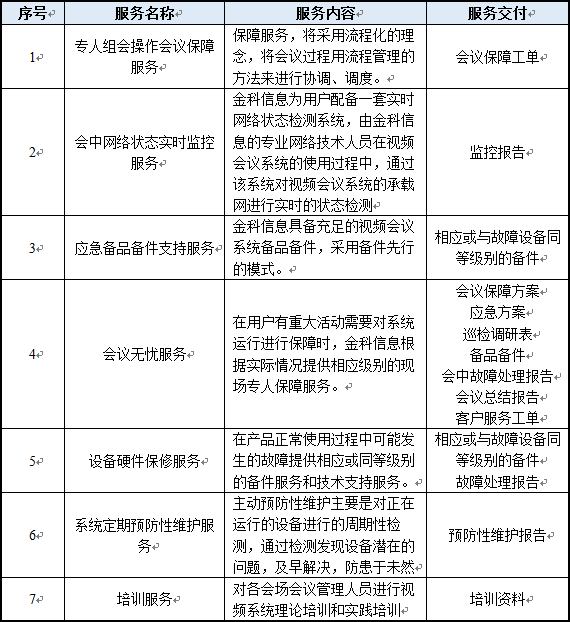 金(jīn)科(kē)信息協作(zuò)無憂服務建立完善、細緻←→α的(de)操作(zuò)流程及操作(zuò)指導手冊,對(duì)視(sh↓α→←ì)頻(pín)會(huì)議(yì)系統的(de)所有(yǒu)操作↕↔¶(zuò)人(rén)員(yuán)進行(xíng)定期的(de)培訓和(hé)演練,固化¶↑→₽(huà)其操作(zuò)習(xí)慣;對(duì)視(shì)頻(pín)會(huì)議(yì)✔系統進行(xíng)全面、細緻、準确的(de)檔案梳理$≠(lǐ);建立嚴格的(de)定期巡檢及報(bào)告、預案制(zhì)度。